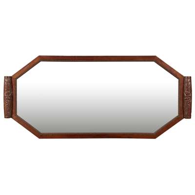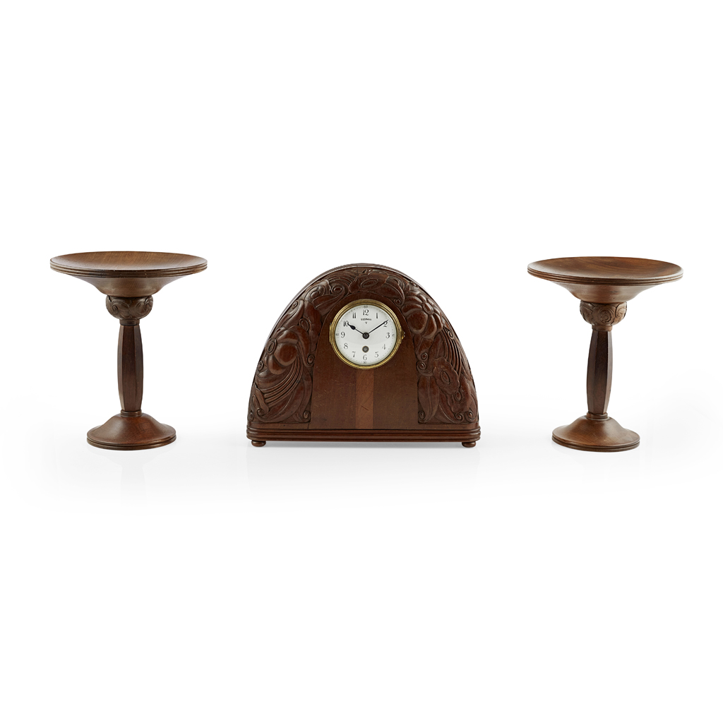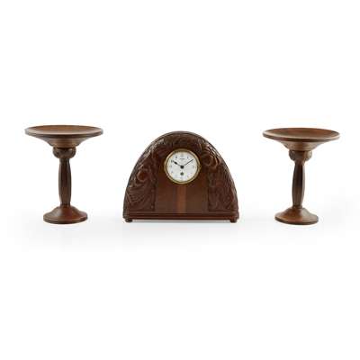 each piece carved in low relief with stylised flowering foliage, comprising a MANTEL CLOCK, 28.5cm high; a PAIR OF TAZZAS, 29cm high; and a WALL MIRROR, of canted rectangular outline, with rope hanging supports, 50cm x 112cm (4)