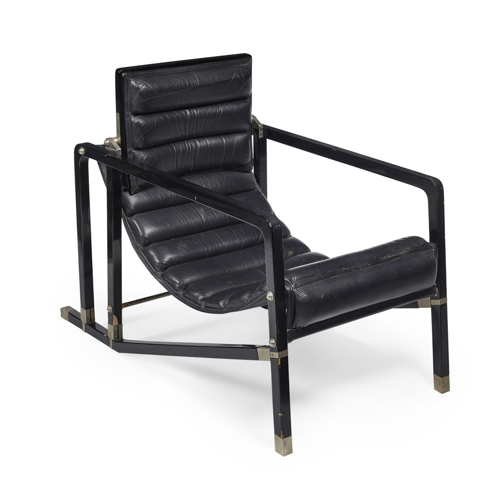 black lacquered beech with adjustable back cushion and seat upholstered in black leather, nickel fittings