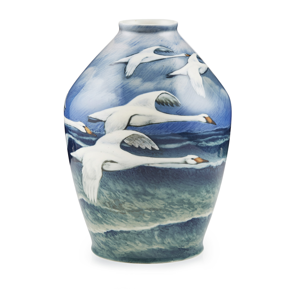 painted with a continuous scene of flying swans in a landscape, painted maker's marks RÖRSTRAND/ TJ/ E
