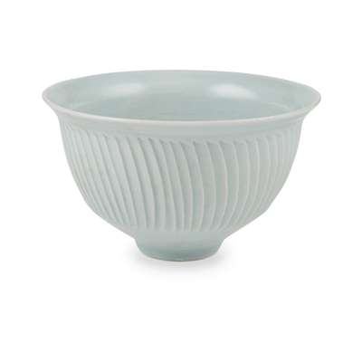 with ribbed decoration, covered in a powder blue glaze, impressed seal mark