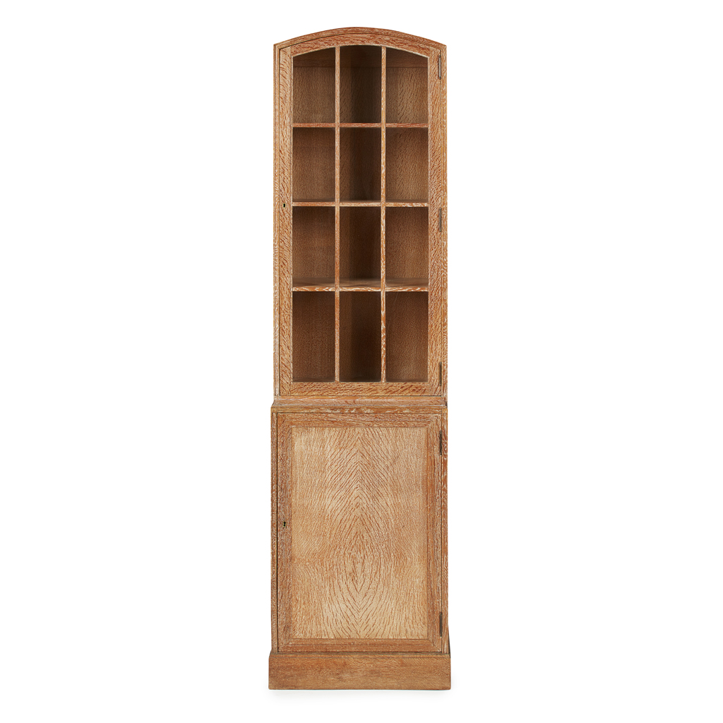 of arched form with single astragal glazed door enclosing three shelves, over single door, bears maker's mark HEALS/ TOTTENHAM COURT ROAD/ LONDON/ W.1