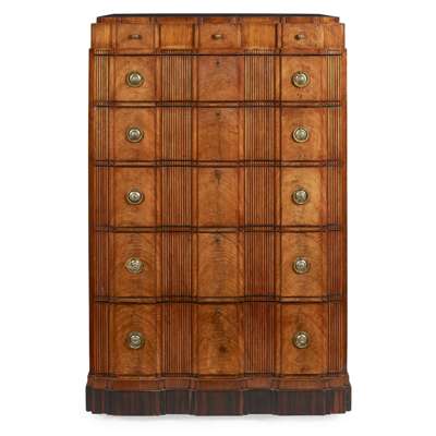 the front with incised decoration, comprising three short drawers above six graduated drawers raised on a plinth, bears maker's label and marks to inside of drawer BCM/ 1928/ C.A. RICHTER, stamped serial numbers to rear 19826/ 9769/ 2
