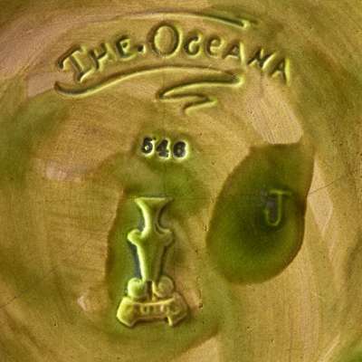 moulded with fish in a foaming sea and covered in a green glaze, impressed and applied maker's marks 'THE OCEANA/ 546/ AULT