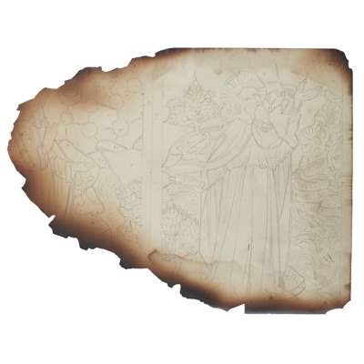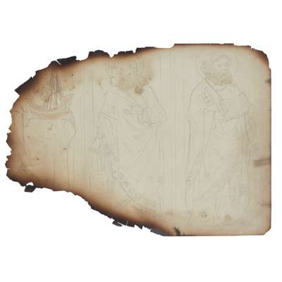 Note: These sheets are leaves from a sketch-book from the Hardman Archive and demonstrate fire damage to their edges. A large proportion of the Hardman archive, particularly their Medieval Room, was damaged and destroyed in a fire at the Newhall Hill studio in 1970.