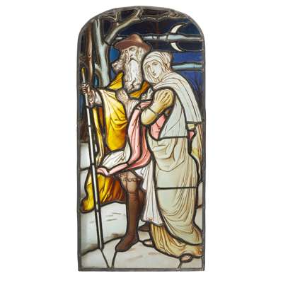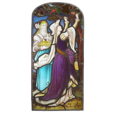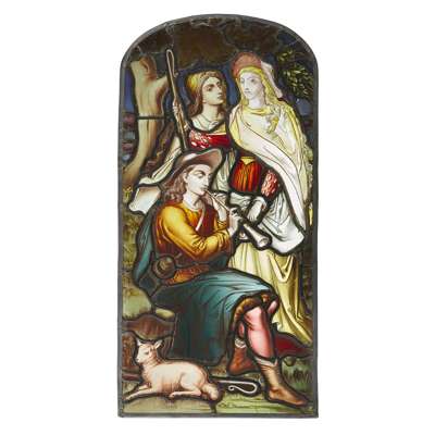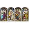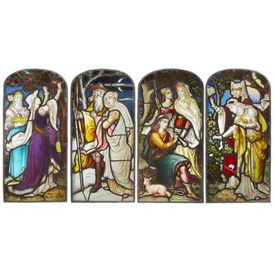 THE FOUR SEASONS: A SET OF FOUR ARTS & CRAFTS STAINED, LEADED AND PAINTED GLASS PANELS, CIRCA 1900
