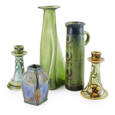 including TWO MINTONS SECESSIONIST CANDLESTICKS, each with maker's marks, 17cm high; a GLASS VASE, 32cm high; a ROYAL DOULTON STONEWARE VASE, 13cm high; and a BELGIAN ART POTTRY JUG, 26cm high (5)