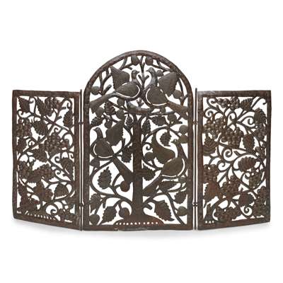 the three-fold screen with hinged side panels pierced and repoussé-decorated with birds in branches