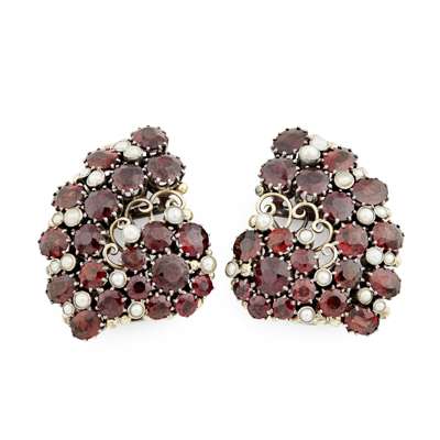 each of quadrant form, with scrolled openwork, set with facetted garnets and pearls (2)