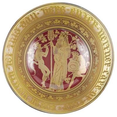 decorated to the interior with a bacchanalian procession within and band of fruiting vines and bearing inscription to rim GOD OF YOUTH LET THIS DAY HERE ENTER WITHOUT CARE OR FEAR, impressed maker's marks and date, painted artist's cypher, bears applied exhibition label