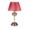 converted to electricity from an oil lamp, with hemispherical reservoir pierces and repoussé-decorated with flower sprigs above turned and knopped column on a corresponding repousse-decorated domed base, later pleated red silk shade