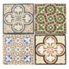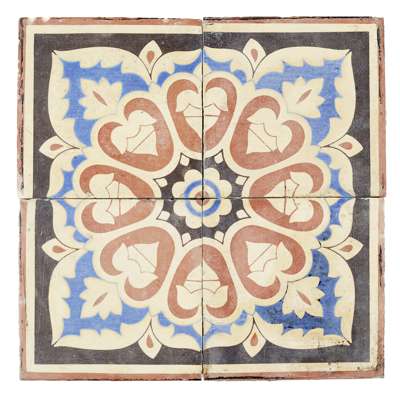 comprising two sets of four tiles each, the first with a central flowerhead issuing stylised leaves; the second with a central rosette enclosed by eight petals; together with two further tiles with four leafy roundels each, in different colour ways; and two further tiles with four flowerhead roundels each, also in different colour ways; variously marked (12)