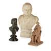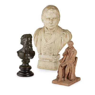 painted plaster maquette, inscribed to verso B. CRESWICK/ AD 1877, 33cm high; together with a SMALL TERRACOTTA FIGURE, modelled as a seated literary gentleman, indistinctly signed, 19.5cm high; and a BRONZE BUST OF FREDERICK LORD LEIGHTON, after Sir Thomas Brock, on a matched socle base, bust 16cm high (3)
