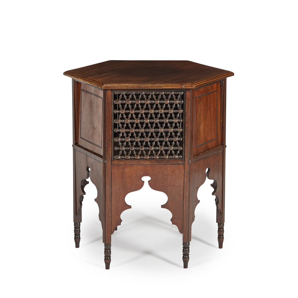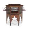 the hexagonal top above alternate fretwork panels and pull-down doors on turned legs