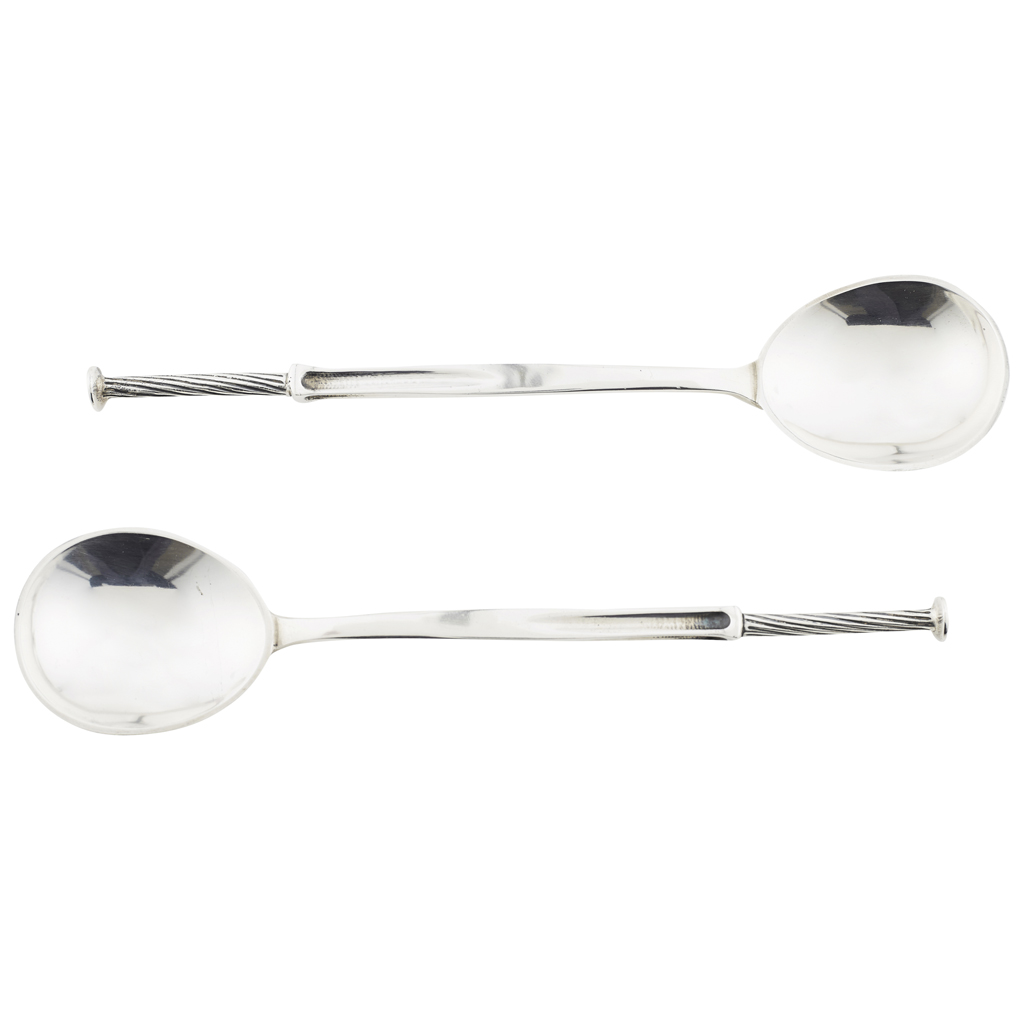 each with ovoid bowl, tapering fluted stem and spirally fluted nail-shaped finial, each with stamped maker's marks L&Co, hallmarked Birmingham 1902, within original leather fitted case stamped in gilt LIBERTY & CO. LTD. REGENT STREET LONDON (2)