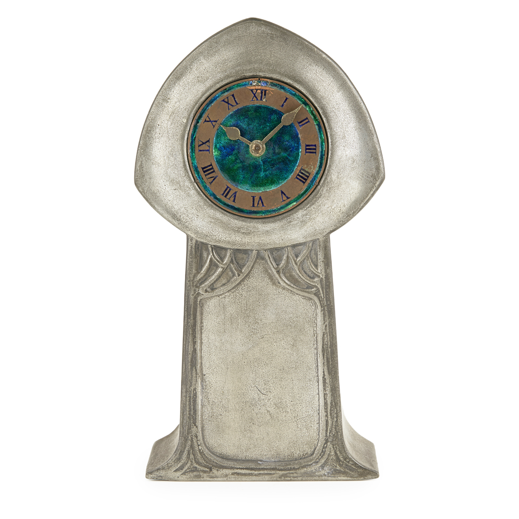 'TUDRIC' PEWTER AND ENAMEL MANTEL CLOCK, CIRCA 1900