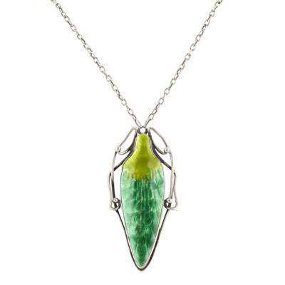 the shaped ovoid pendant in green enamels cast within entwined whiplash tendrils, with fine link chain, stamped marks NEWLYN/ ENAMEL