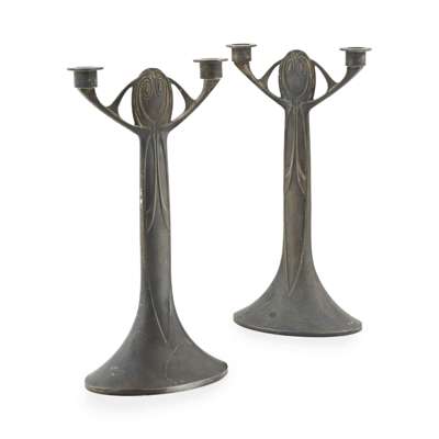 PAIR OF JUGENDSTIL PATINATED PEWTER CANDLESTICKS, MODERN