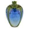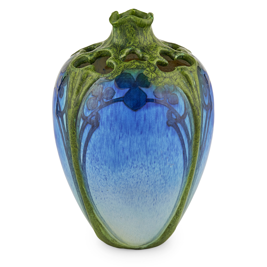 the pinched mouth above a tapered ovoid body with trefoil cut-outs to the shoulder, decorated with a matt green two-tone glaze enclosing ombre blue glazed panels with twining trefoil leaf motifs, signed LACHENAL with incised marks