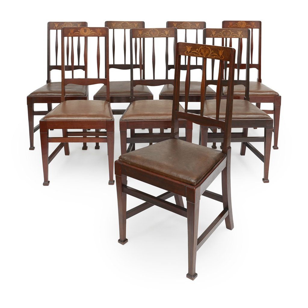 SET OF EIGHT ART NOUVEAU INLAID MAHOGANY DINING CHAIRS, CIRCA 1910