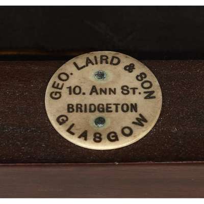 each with brander backs and marquetry-inlaid top rails above drop-in seats and square tapered legs linked by stretchers, each bears label for GEORGE LAIRD & SON, GLASGOW (8)