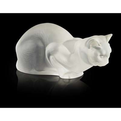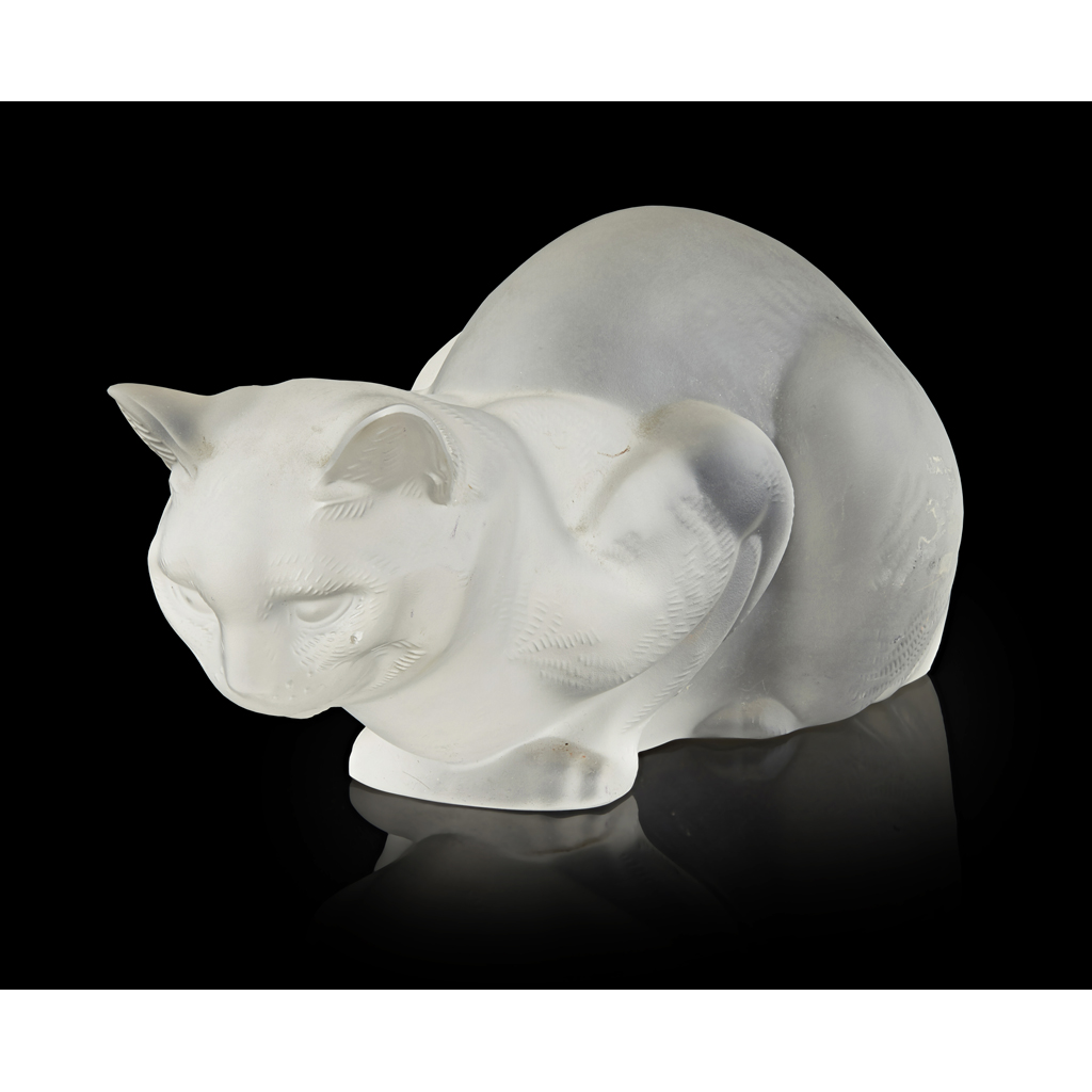 FROSTED GLASS FIGURE OF A CROUCHING CAT, POST 1945