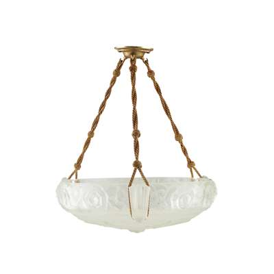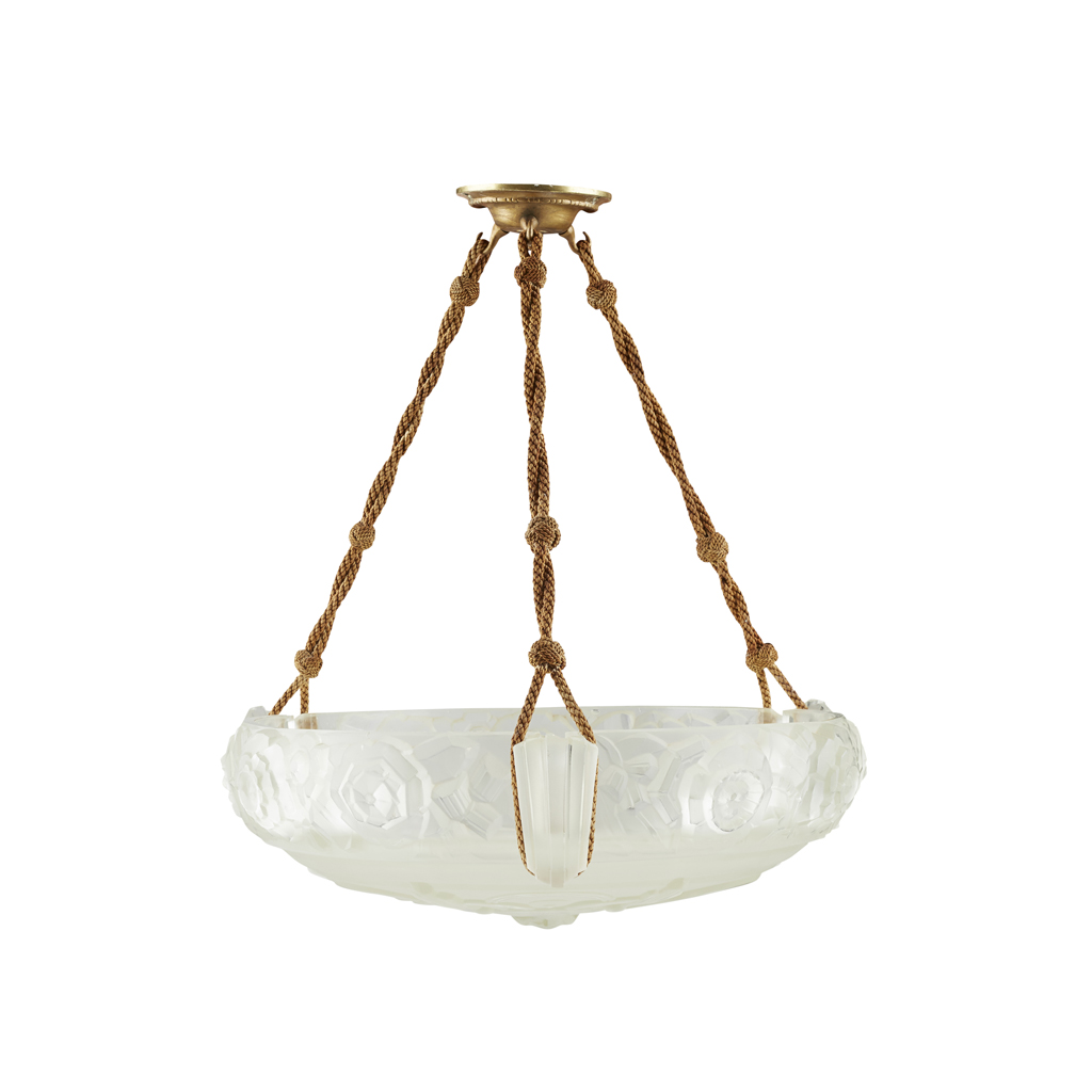 of shallow cylindrical form, moulded in relief with stylised flowering foliage, with original hanging ropes, moulded marks SABINO/ 4651/ PARIS/ DEPOSE