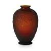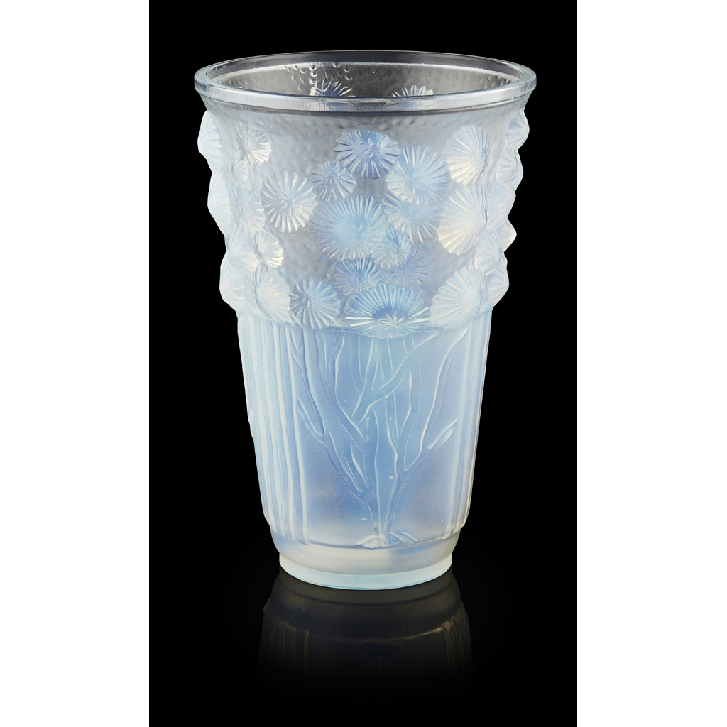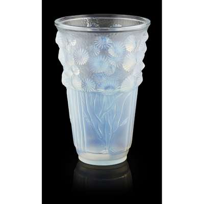 comprising an OPALESCENT GLASS VASE, moulded with limpets and seaweed, etched and moulded marks, SABINO/ FRANCE, 19.5cm high; and a FROSTED RUBY GLASS VASE, moulded with flowering foliage, etched maker's marks SABINO/ FRANCE, 14cm high (2)