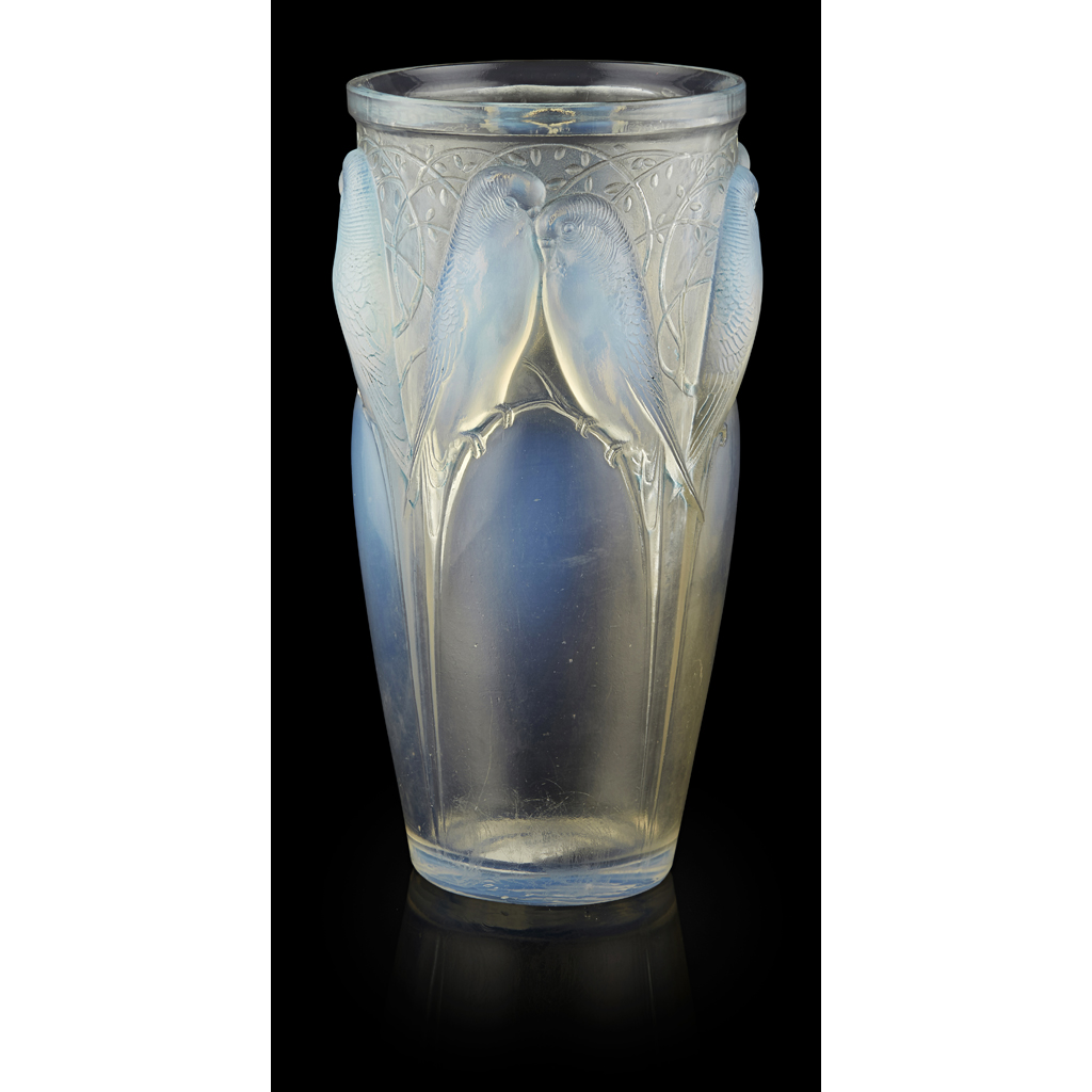 moulded with a frieze of budgerigars, traces of original blue staining, wheel and script-etched maker's marks R. LALIQUE/ FRANCE/ NO. 905, ground rim