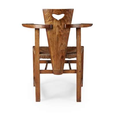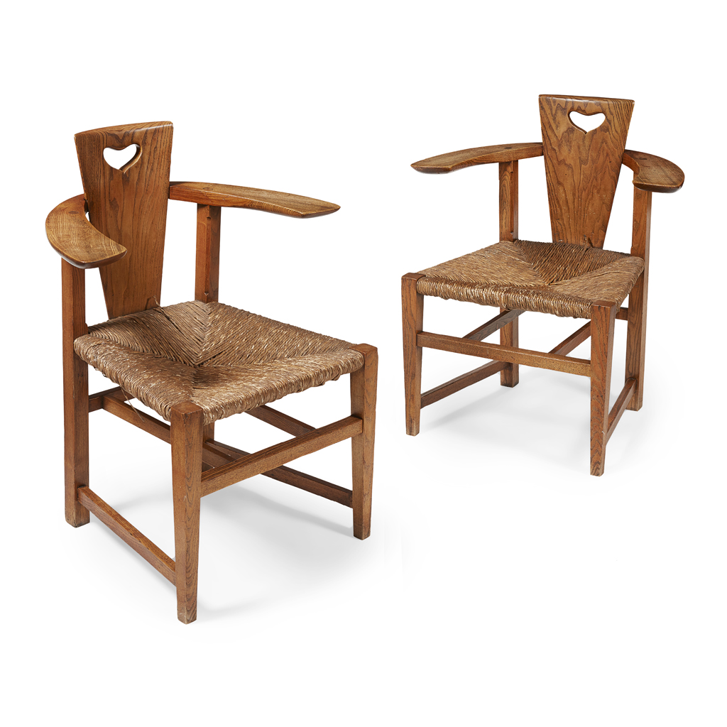 each with broad open arms and tapered splats with heart-shape piercings, above rush seats on square tapering legs linked by stretchers (2)