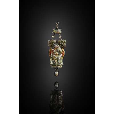 Note: James Cromar Watt trained as an architect, later teaching himself metalworking and enamelling, inspired by contemporary artists such as Alexander Fisher and Phoebe Anna Traquair. By 1896 he had resigned his associateship to concentrate exclusively on work in precious metals, developing particular skills in the ancient techniques of gold granulation and translucent foiled enamelling. His work was exhibited at Turin in 1902 and was extensively illustrated in the 'Art Journal' from that year. He was also a keen botanist, traveller and collector. Although many of his pieces are influenced by his extensive travels and resulting collections of objects he also collaborated with other artists. One of those was his friend Douglas Strachan, one of Scotland's foremost stained glass artists, and the designer of the present lot.