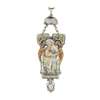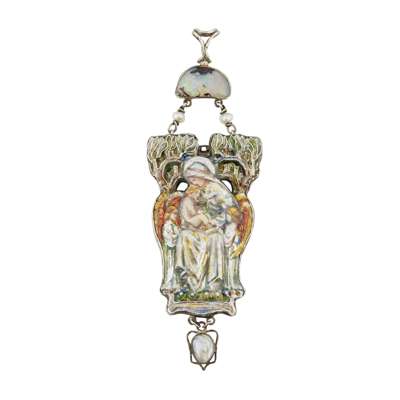 worked as the Virgin and Child, flanked by angels, with pearl-set drop, the bail suspending an opal stone with twin suspending chains set with seed pearl spacers, fitted within original box