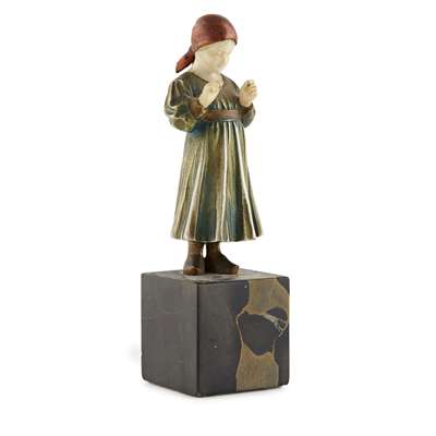 cast as a girl in a headscarf, raised on a marble cube base, etched signature mark to base F. PREISS