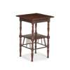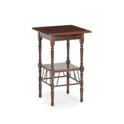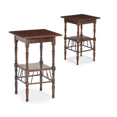 one with an inlaid top, each with square tops raised above turned and blocked legs supporting a lower tier with spindle gallery (2)