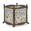 the cast metal frame inset with four 6 inch tiles from the 'Idylls of the Kings' series, including VIVIEN, ELAINE, GUINEVERE, and ETARRE, printed in brown with blue backgrounds