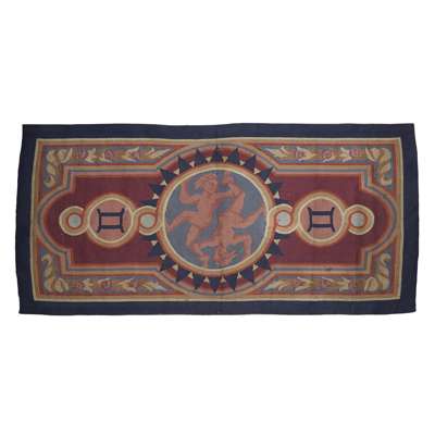worked in coloured wools with a roundel depicting Castor and Pollux flanked by the symbol for Gemini and enclosed within floral and foliate border