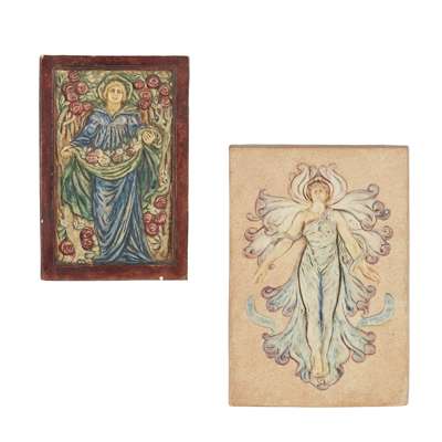 TWO POTTERY WALL PLAQUES OF A LADY WITH ROSES AND THE SPIRIT OF THE LILY