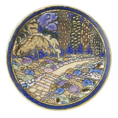 depicting a colourful landscape with cypress trees, impressed mark for PINDER BOURNE & HOPE, painted mark 1003/ H.S. DOULTON/ LAMBETH/ LONDON/ AT/ FJ, restored