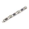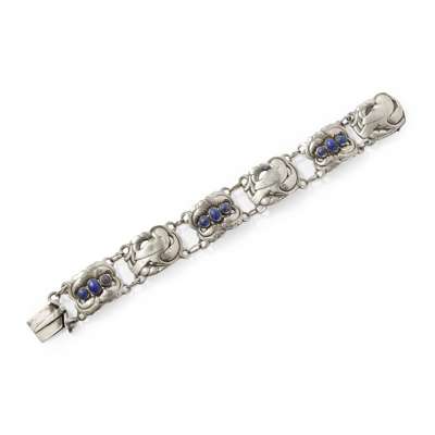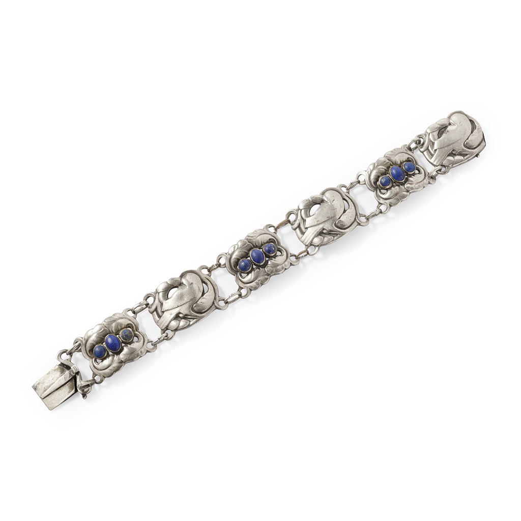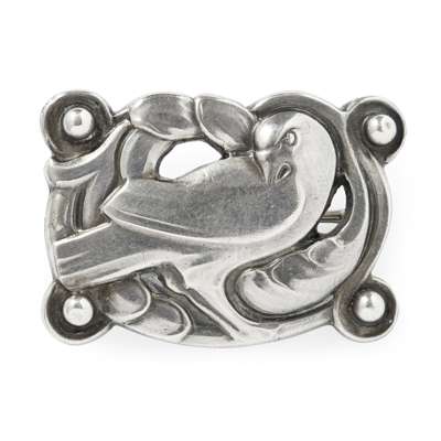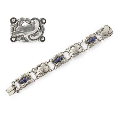 with alternating links of doves and scrolling foliage set with lapiz lazuli cabochons, stamped maker's marks GEORG JENSEN/ 830/ DENMARK/ 14, 19.5cm long; and a GEORG JENSEN STERLING SILVER BROOCH, designed as a dove amongst scrolling foliage, stamped maker's marks 925/ STERLING DENMARK/ 111, 3cm long (2)