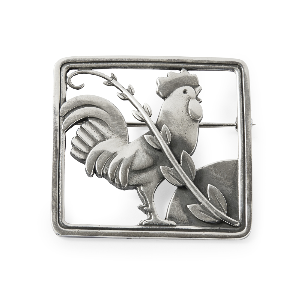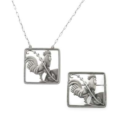 designed with a cockerel within a square frame, stamped maker's marks GEORG JENSEN/ STERLING DENMARK/ 276, 3.7cm square; and a STERLING SILVER PENDANT, with the same design, with link chain, stamped maker's marks GEORG JENSEN/ STERLING DENMARK/ 96, 3.7cm square (2)
