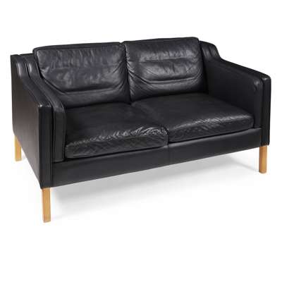 upholstered in black leather with loose cushions raised of square wood legs, maker's marks under cushions