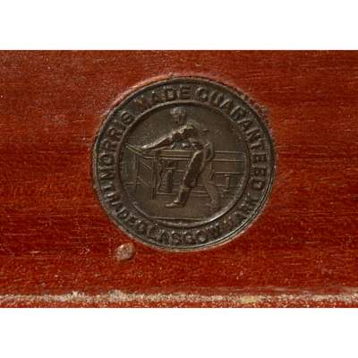laminated wood, with drop-in seat, later covered, bears maker's label MORRIS MADE/ GUARANTEED TRADE MARK/ GLASGOW