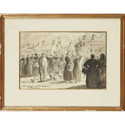 pen, ink and wash, signed and inscribed lower left THE WOMEN OF BOULOGNE/ N. BENOIS, framed