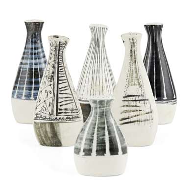 comprising two tall pepper pots and one tall salt pot, impressed factory marks, 16.5cm high; two unglazed pots, impressed factory marks,16cm high; and one small pepper pot, impressed factory marks, 9.5cm high, each decorated with abstract forms in green and blue (6)