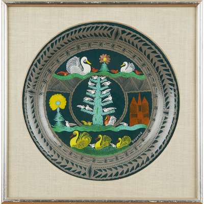painted in colours with stylised trees and birds on a deep green ground, signed SCOTTIE, mounted and framed
