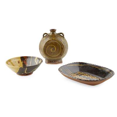 each with slip decoration, comprising a MOONFLASK, 28cm high; a SERVING DISH, 35.5cm diameter; and a BOWL, 26.5cm diameter (3)