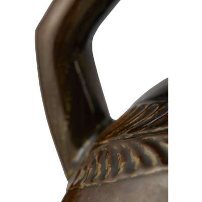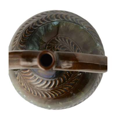 with incised swirl decoration, covered in a streaky green and brown glaze, impressed maker's marks C. DRESSER