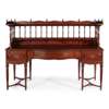 inlaid with stringing and chequer banding, the rear superstructure with a three-quarter rear shelf surmounted by turned finials above turned spindle supports and a lower open shelf, the mounted shaped top above a frieze drawer flanked by fielded panel drawers on tapering square legs joined by a shaped stretcher