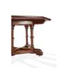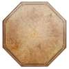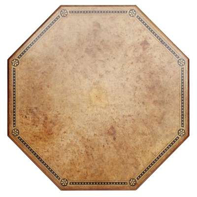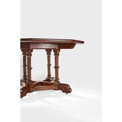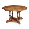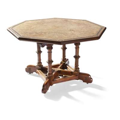 the octagonal top with burr veneers, inlaid with a band of florets, above leaf carved brackets and ring-turned legs, on a cruciform base with tracery infill panels
