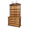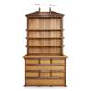 the cornice with pennant decoration, above three open shelves, the base with an arrangement of eight drawers on a plinth base