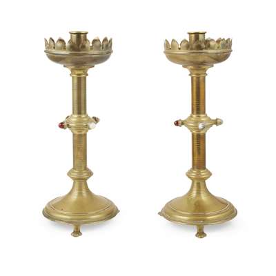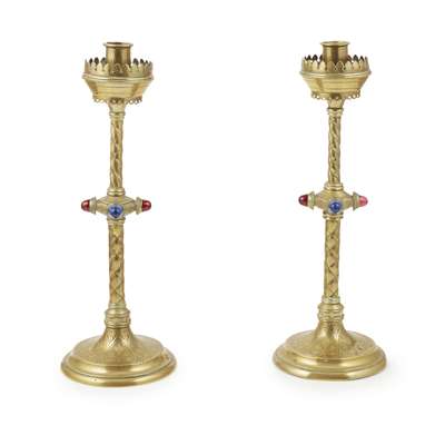 TWO PAIRS OF GOTHIC REVIVAL JEWELLED BRASS CANDLESTICKS, CIRCA 1880